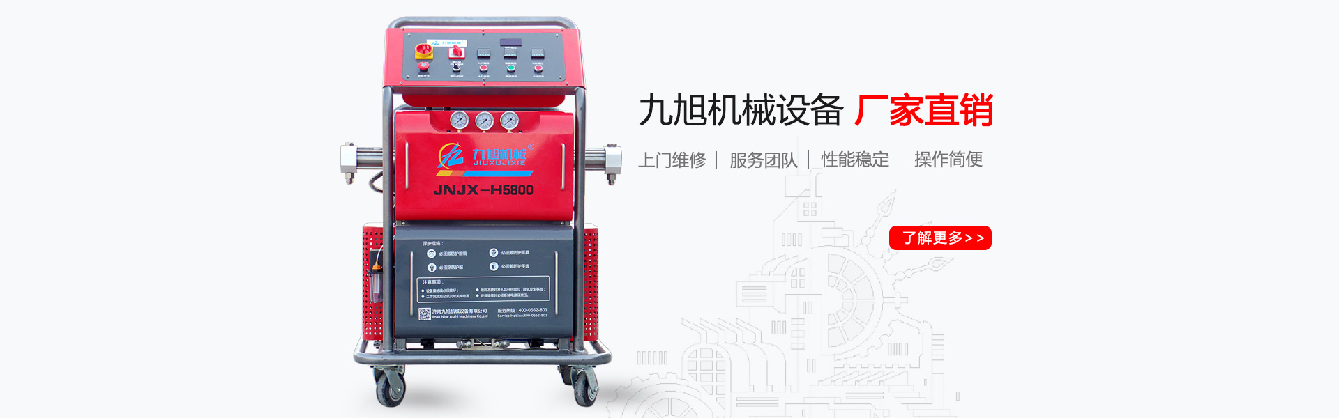 山東九旭機(jī)械科技有限公司歷經(jīng)十幾年的發(fā)展,已成長(zhǎng)為聚氨酯設(shè)備行業(yè)頗具實(shí)力的設(shè)備制造廠家之一。企業(yè)主要產(chǎn)品:聚氨酯噴涂機(jī)、聚氨酯發(fā)泡機(jī)、聚氨酯澆注機(jī)、聚脲噴涂機(jī)等,關(guān)于設(shè)備配件(聚氨酯高壓噴槍、槍嘴、加熱管道、料塊、摩擦副、增壓泵、混合式、提料泵等)也是堅(jiān)持最好的質(zhì)量服務(wù)用戶(hù),并承接:外墻保溫、冷庫(kù)保溫發(fā)泡等工程...